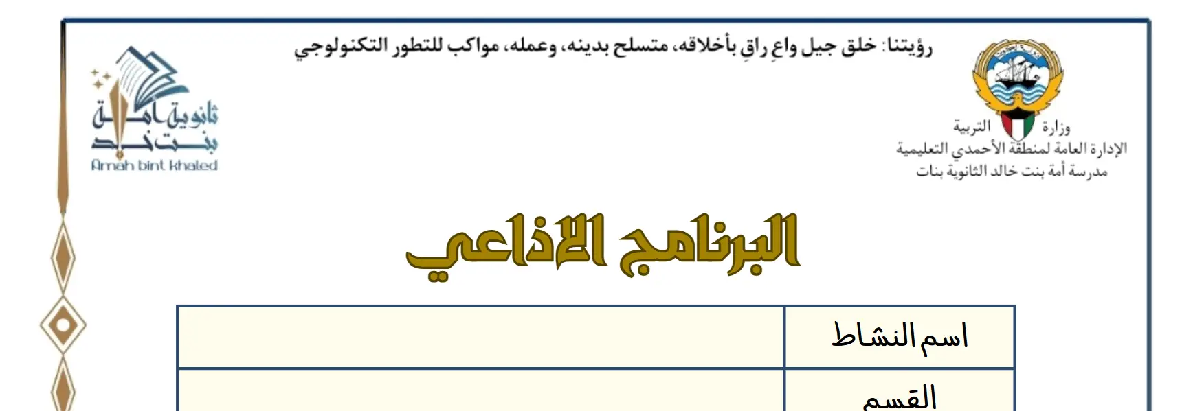 اسم النشاطالقسم العلمياليوم والتاريخاسم المعلمةنبذة مختصرة عن النشاطالصوراختر الملفلم يتم اختيار الملفDelete uploaded fileالصوراختر الملفلم يتم اختيار الملفDelete uploaded fileالصوراختر الملفلم يتم اختيار الملفDelete uploaded fileاضغط هنا لاعتماد النموذج و تحميله في أعلى الصفحة