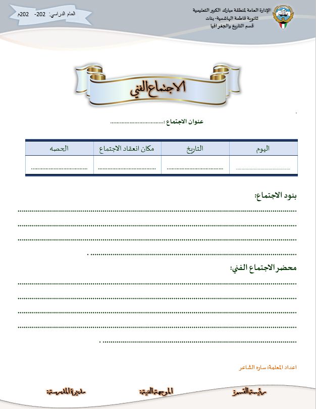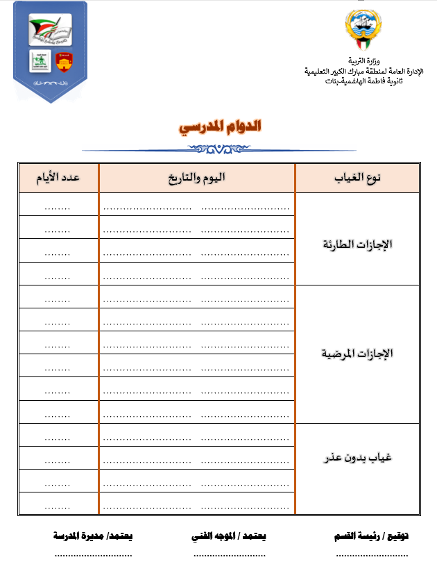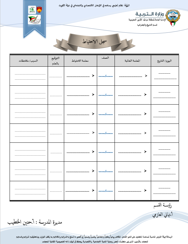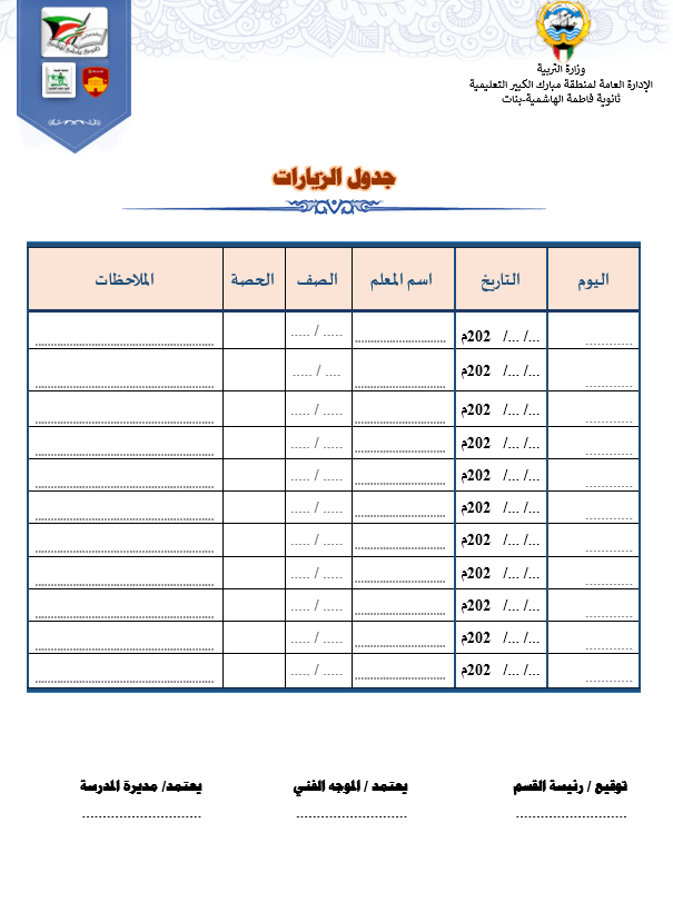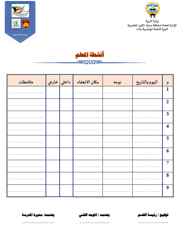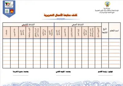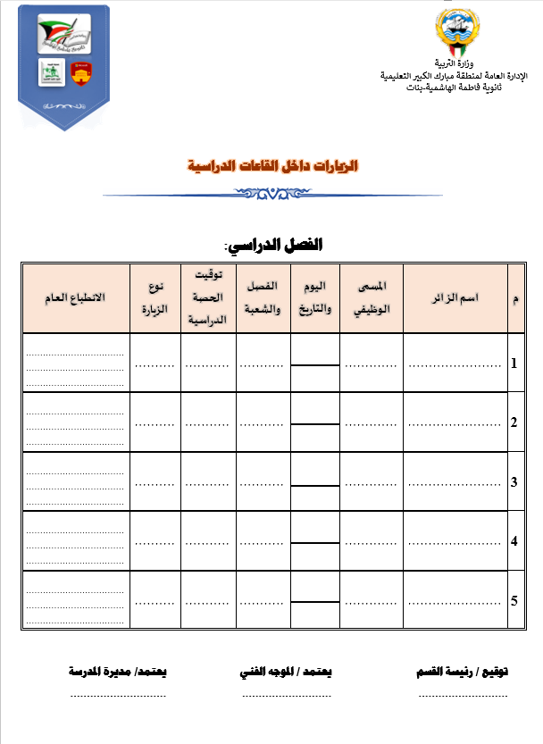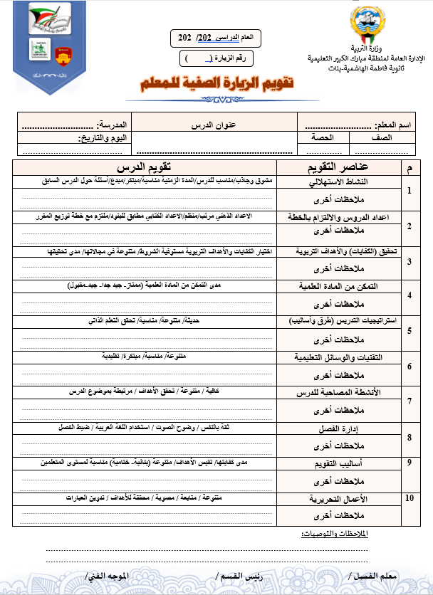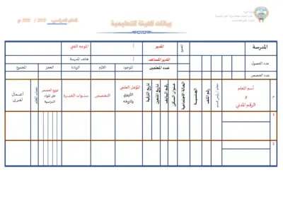 رئيس القسم الدوام المدرسي لتحميل الملف متابعة ما قطع من المنهج لتحميل الملف تقييم الزيارة الصفية لتحميل الملف الزيارات داخل القاعات لتحميل الملف جدول الزيارات لتحميل الملف تقرير زيارة الموجه الفني لتحميل الملف بيانات المعلم لتحميل الملف أنشطة المعلم لتحميل الملف الاستئذانات لتحميل الملف سجل الاحتياط لتحميل الملف الخطة الاسبوعية لتحميل الملف تقرير الاجتماع الفني لتحميل الملف بيانات الهيئة التعليمية لتحميل الملف فورمة استبانة لورشة/درس لتحميل الملف نموذج الانماء المهني لتحميل الملف متابعة الأعمال التحريرية لتحميل الملف