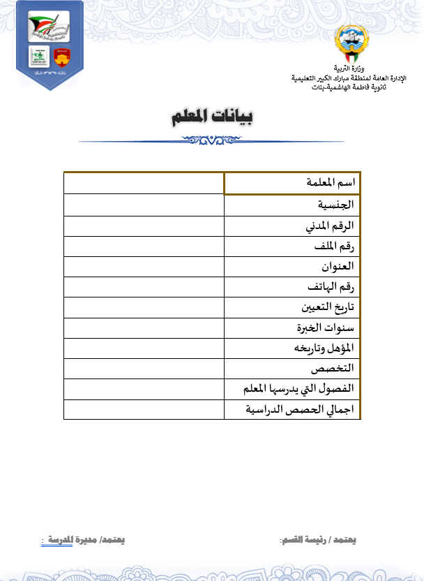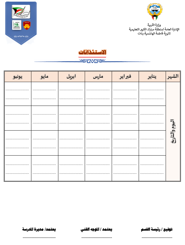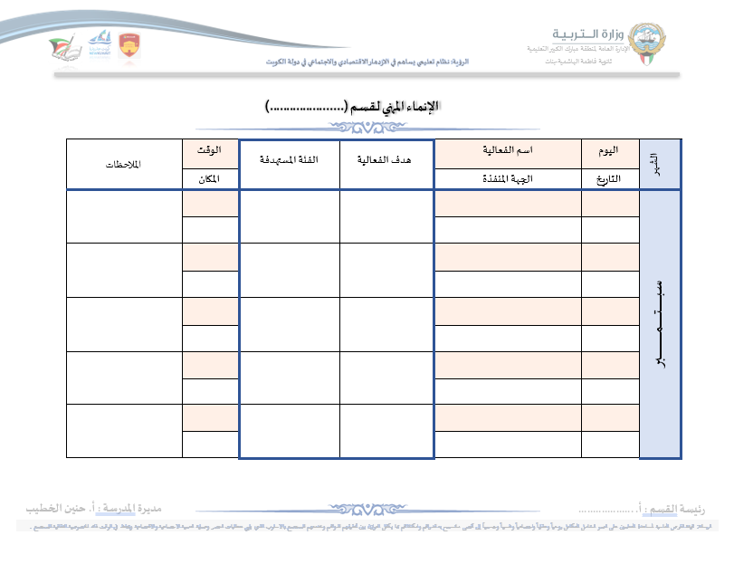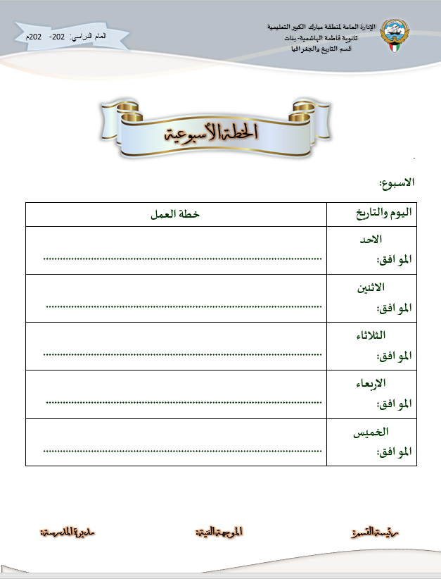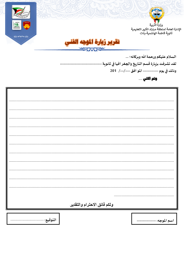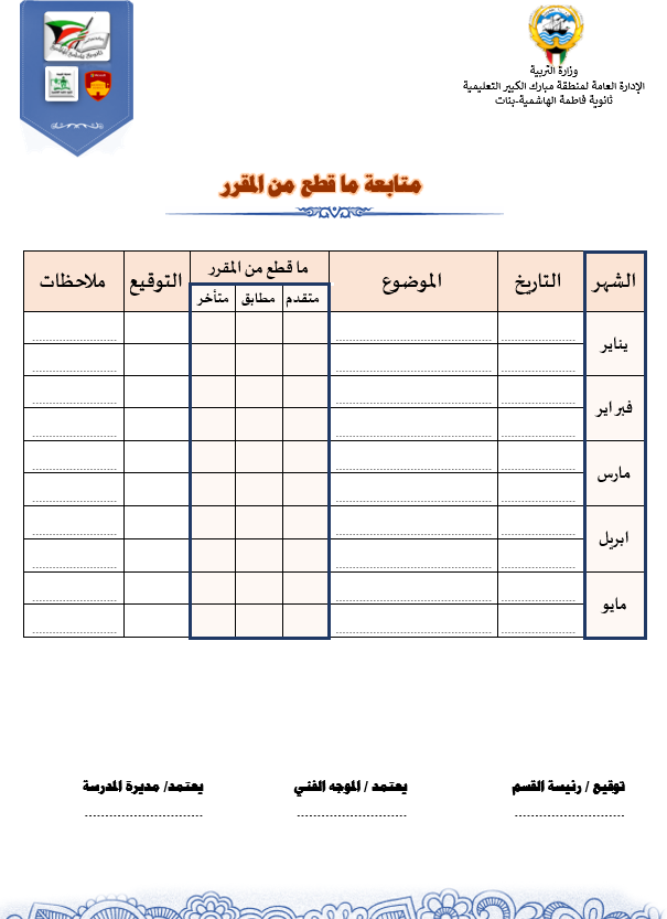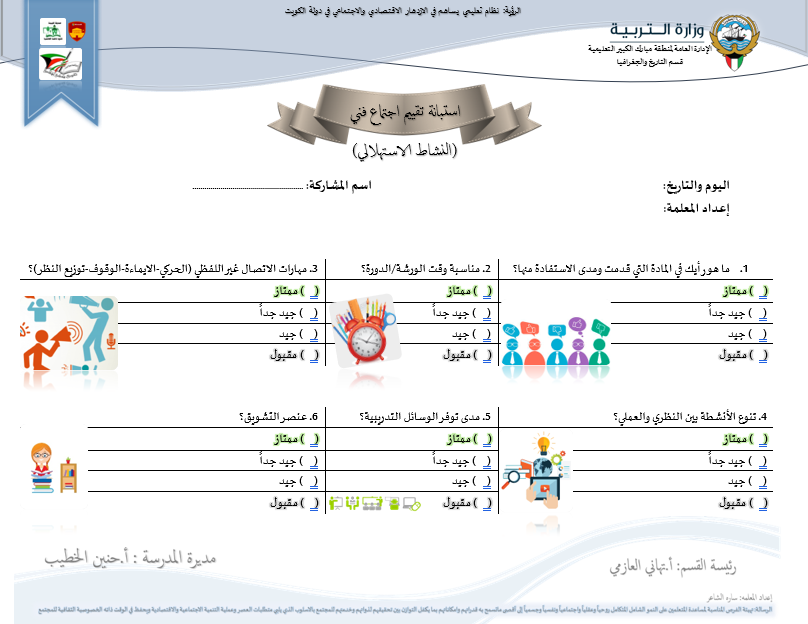 رئيس القسم الدوام المدرسي لتحميل الملف متابعة ما قطع من المنهج لتحميل الملف تقييم الزيارة الصفية لتحميل الملف الزيارات داخل القاعات لتحميل الملف جدول الزيارات لتحميل الملف تقرير زيارة الموجه الفني لتحميل الملف بيانات المعلم لتحميل الملف أنشطة المعلم لتحميل الملف الاستئذانات لتحميل الملف سجل الاحتياط لتحميل الملف الخطة الاسبوعية لتحميل الملف تقرير الاجتماع الفني لتحميل الملف بيانات الهيئة التعليمية لتحميل الملف فورمة استبانة لورشة/درس لتحميل الملف نموذج الانماء المهني لتحميل الملف متابعة الأعمال التحريرية لتحميل الملف