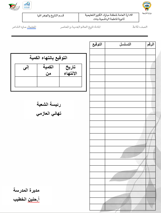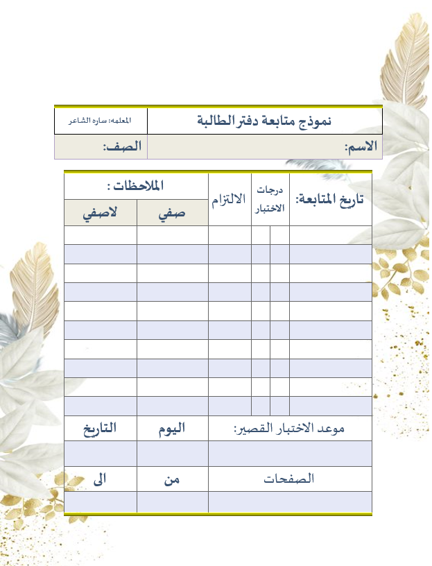 نماذج للمعلم الهدف الشامل لتحميل الملف اهداف المرحلة الثانوية لتحميل الملف الاهداف السلوكية لتحميل الملف المستويات لتحميل الملف بطاقة استئذان لتحميل الملف متابعة1 لتحميل الملف متابعة2 لتحميل الملف متابعة3 لتحميل الملف مقدمة السجلات لتحميل الملف تقرير زيارة لتحميل الملف العلم بموعد الاختبار القصير لتحميل الملف العلم بانهاء المنهج لتحميل الملف