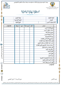 نماذج تفاعلية رفع الملف الإنجازي للقسم اضغط هنا نموذج تقرير فعالية اضغط هنا نموذج الهدف من الزيارة التبادلية اضغط هنا استمارة زيارة تبادلية اضغط هنا تقرير حصة نشاط اضغط هنا نموذج تقرير مشروع طموح اضغط هنا نموذج تقرير تطبيق التعليم عن بعد اضغط هنا نموذج تقرير اجتماع أو لجنة اضغط هنا تقرير فعالية فريق اضغط هنا تقرير آسك مي Ask Me اضغط هنا نموذج (1) تقويم الزيارة الصفية للمعلم اضغط هنا نموذج الساعات التدريبية اضغط هنا نموذج تحضير لمادة تاريخ الكويت اضغط هنا نموذج تحضير تاريخ اضغط هنا نموذج تحضير جغرافيا اضغط هنا نموذج (1) تقويم الزيارة الصفية للمعلم اضغط هنا نموذج (2) تقويم الزيارة الصفية للمعلم اضغط هنا نموذج (3) تقويم الزيارة الصفية للمعلم اضغط هنا نموذج (4) تقويم الزيارة الصفية للمعلم اضغط هنا
